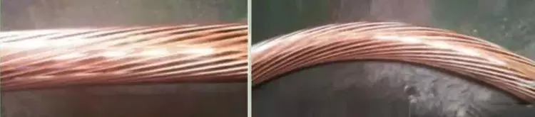 彎曲對導(dǎo)體的影響:電纜導(dǎo)體由多根單芯導(dǎo)線以一定節(jié)距絞合而成,在導(dǎo)體制作過程中導(dǎo)體的單線根數(shù)和節(jié)距大小決定了導(dǎo)體彎曲時(shí)的穩(wěn)定性,過大的彎曲將導(dǎo)致導(dǎo)體的松散和突起,直接影響導(dǎo)體外層半導(dǎo)電層和絕緣層的性能。